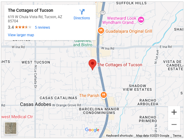 Cottages of Tucson is a warm, residential Memory Care community designed to feel like home while providing the personalized support your loved one needs. Our cottage-style setting creates a comfortable, familiar environment where residents receive attentive care, and families gain peace of mind knowing their loved one is supported by a compassionate, experienced team.